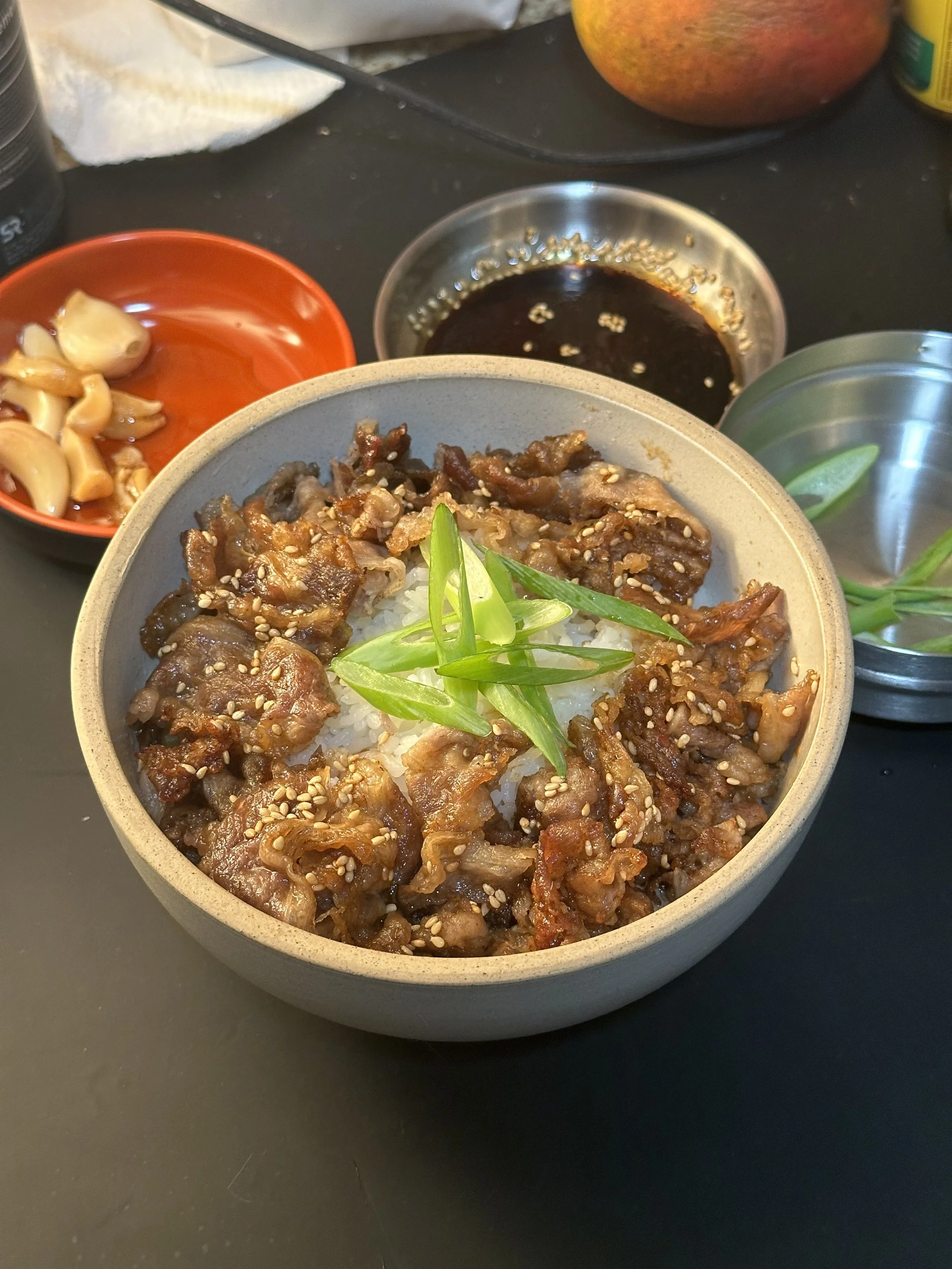 Ratio is 2:1:1 for soy sauce, mirin, and sesame oil. Adjust to preferred taste